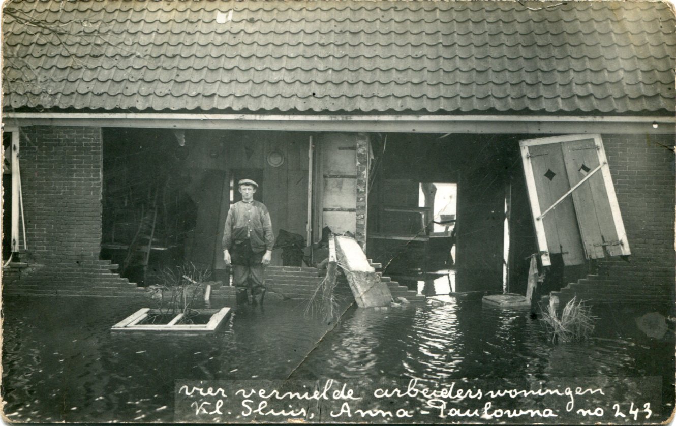 Ik had een vreemde vraag, voor mijn boek wil ik bij een van de Anna Paulowna watersnoodkaarten van Jonker uitzoeken, wie er op een bepaalde foto staat. Het gaat om fotokaart No 243 uit de grote watersnoodserie van Jonker en de man staat hierop voor zijn vernielde arbeiderswoning in Kleine Sluis.