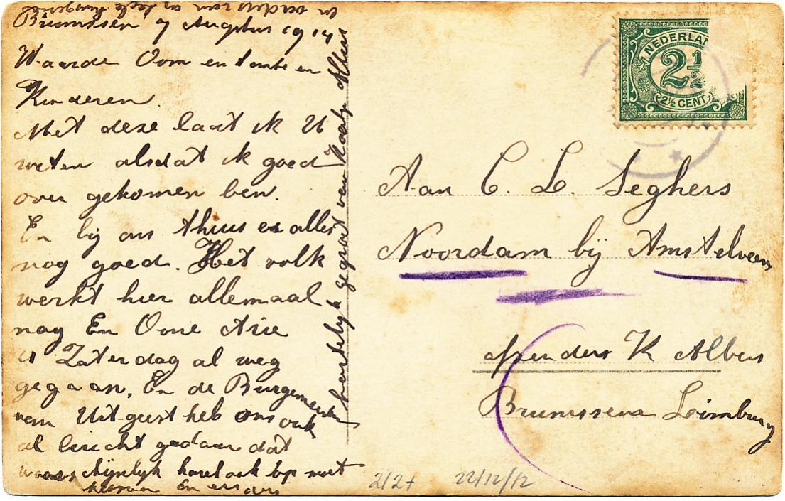 Kaatje Albers laat in Amstelveen weten dat ze goed is aangekomen in Brunssen (ze bedoelt Brunssum) en dat de Burgemeester van Uitgeest ons ook al bericht heb gedaan dat waarschijnlijk Karel ook op moet komen. Een typisch bericht voor die tijd.