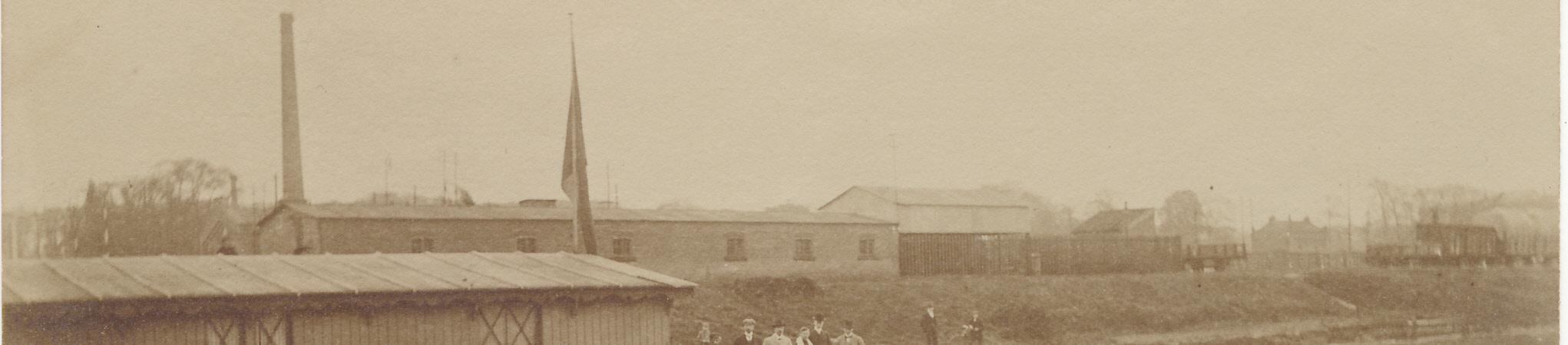 Gezicht op het botenhuis en een acht met stuurman van de roeivereniging Triton in de Kruisvaart te Utrecht; op de achtergrond locomotiefloods Damlust van de Staatsspoorwegen.