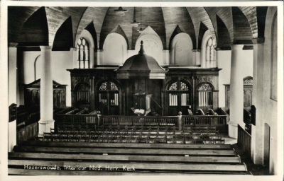 Dit is het interieur van de Hervormde kerk in Hazerswoude-dorp vóór de restauratie van 1946-1949. Interessant is dat men een nieuwe kerk bouwde voor de protestante eredienst, zonder zuilen in het interieur, maar daarbij toch nog teruggreep op het traditionele middeleeuwse grondplan van een kerk met een schip en een veelhoekig gesloten koor. Deze kerk moest dus wel uit het midden van de 17e eeuw dateren. Het zoekplaatje is van omstreeks 1938 (of ouder).