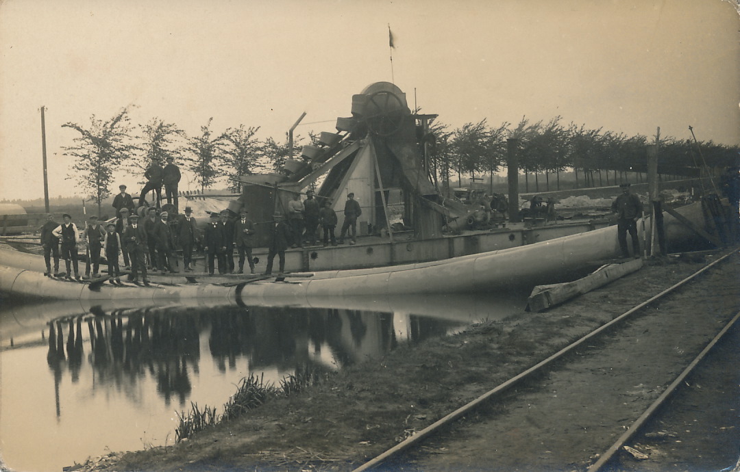 3129g 2 grote metalen buizen met erachter baggervaartuig, fotograaf Coevorden JBI