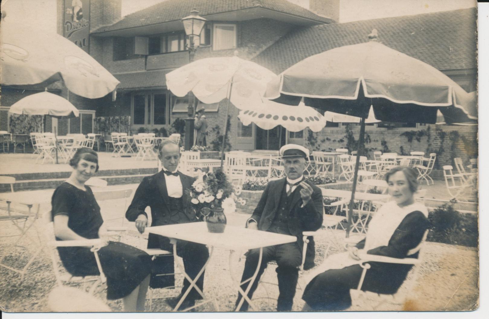 Blijf dit een interessant plaatje vinden . Het idee van een zwembad zoals Martin in 2008 dacht had ik in eerste instantie ook . Dacht zelf aan het terras van natuurbad de Biltsche duinen , waar het niet is . Echter als ik beter kijk vind ik een zwembad niet de beste optie ! Op de achtergrond loopt een dame in een warme jas en heb ik het idee dat dit wel degelijk de straatkant van een cafe/ uitspanning / hotel is .Aan de gevel hangen uithangborden waarop zelfs heel vaag de laatste letters zichtbaar lijkt ? niet een te lange naam en laatste letter FT ?? Geen klein gebouwtje en doet iets stads aan ? Mijn gedachte is nu stationsplein ergens of een terras aan het water ergens ? Kapteinspetje van de rechterman duidt evt. inderdaad op een rivier/ plas oever ? Oosterbeek is in aanhef genoemd , misschien de Rijn ? Wellicht brengen deze spinsels iemand op een iemand