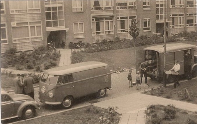 3208g straat tussen woonflats met o.a. Volkswagenbus PW
