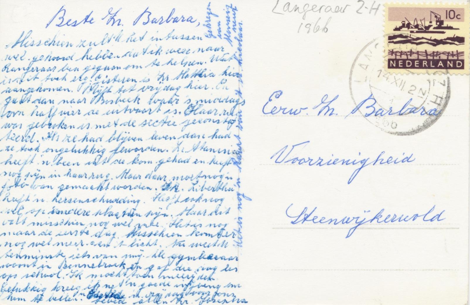 verzonden door Zr. Josepha naar de Eerw. Zr. Barbara