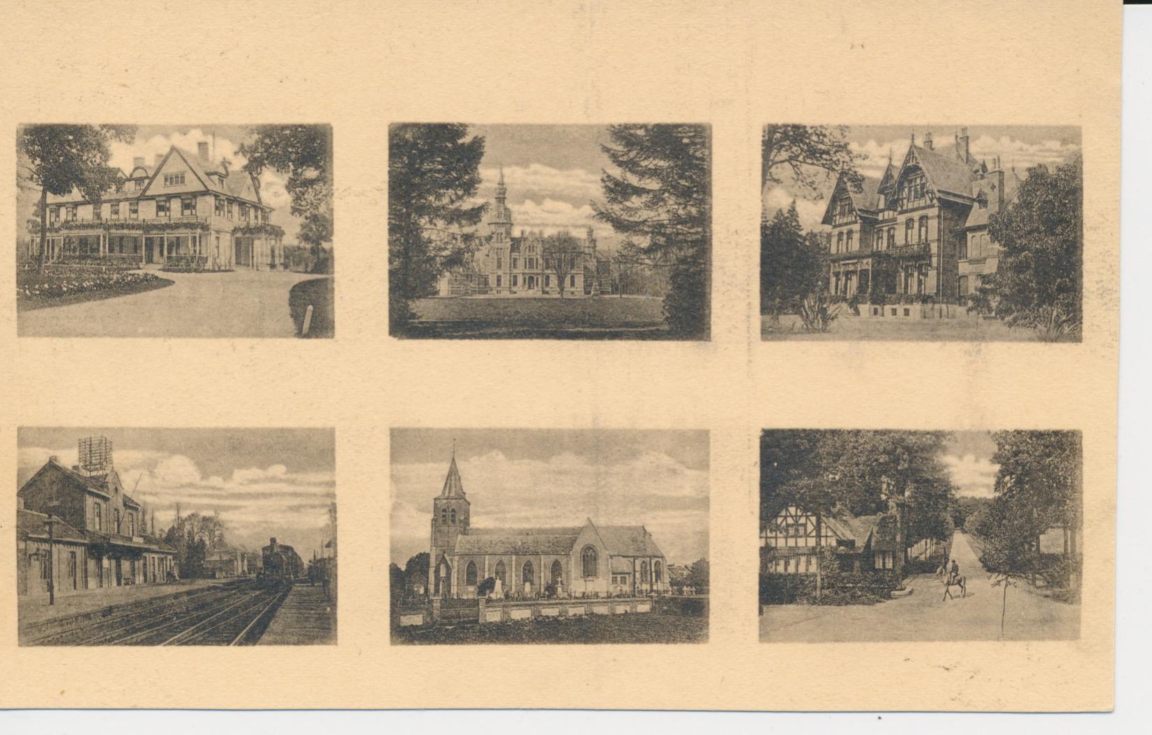 3285 kaart met 6 plaatjes zoals station, kerk, vakwerkhuis