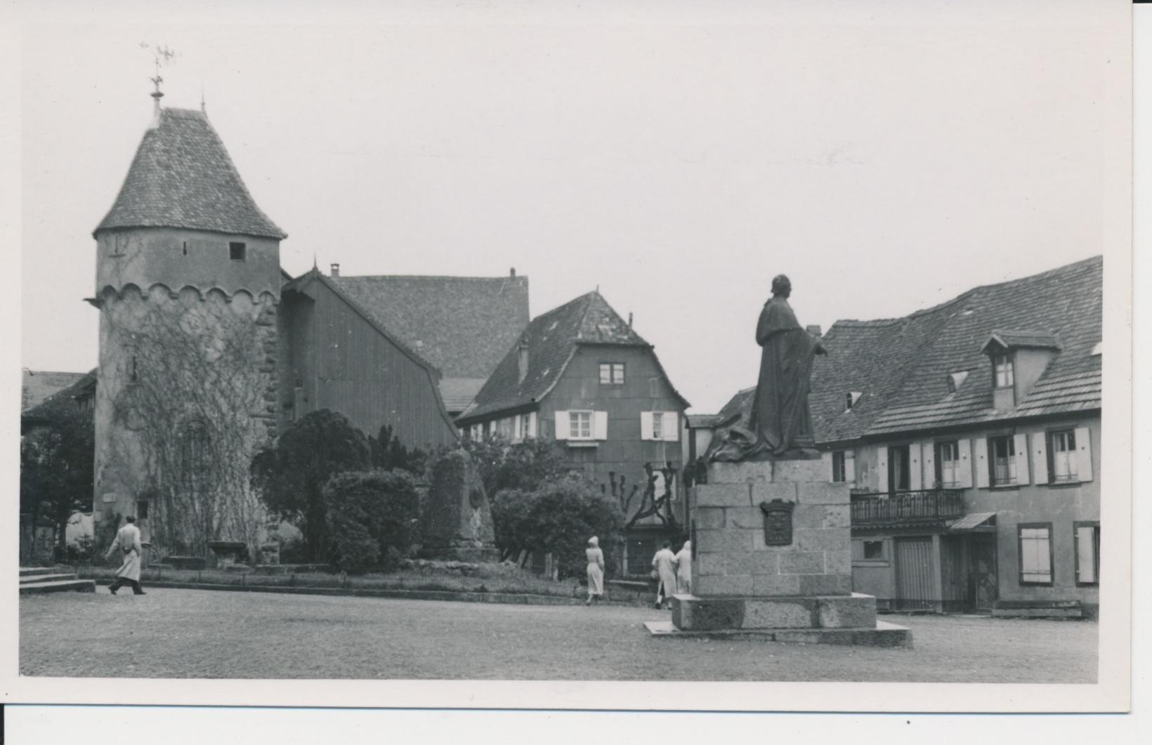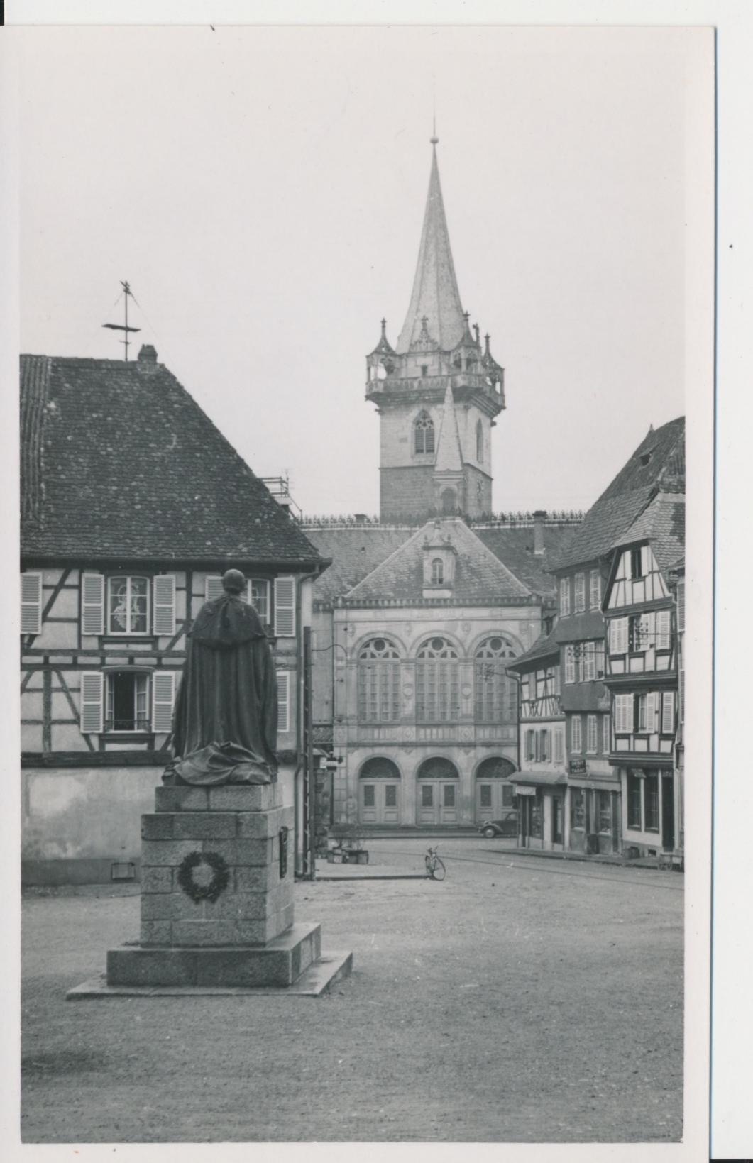 Dit is in Obernai, in de Elzas (Fr). De Rue de Chamoine Gyss met het standbeeld in van Mgr. Freppel (wie kent hem niet).