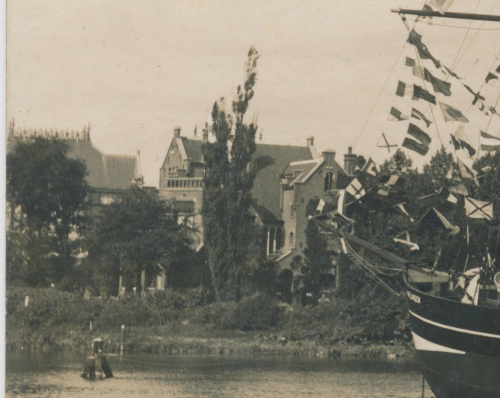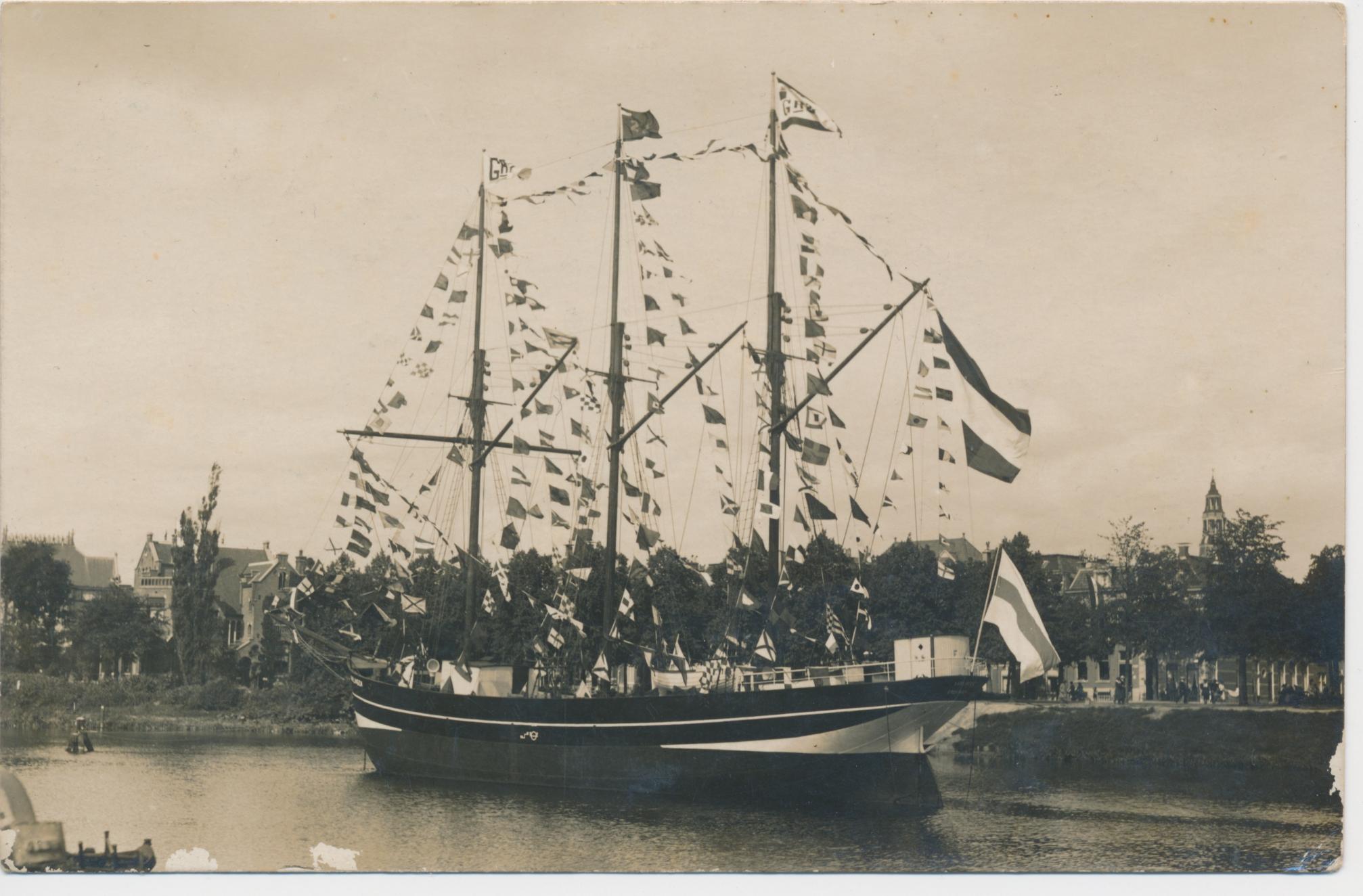 "3 mast schoener in het verbindingskanaal voor het Station geheel gepavoiseerd"