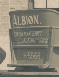 op vrachtauto met kenteken H-5566: Albion. Export-Maatschappij "Jacatra" Rotterdam Scheepmakershaven 33c