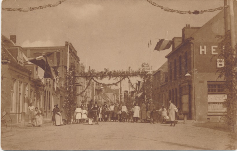 Dit is de Prijssestraat in Culemborg. Links staat de sigarenkisten- en etikettenfabriek 'Imprimatur'.
