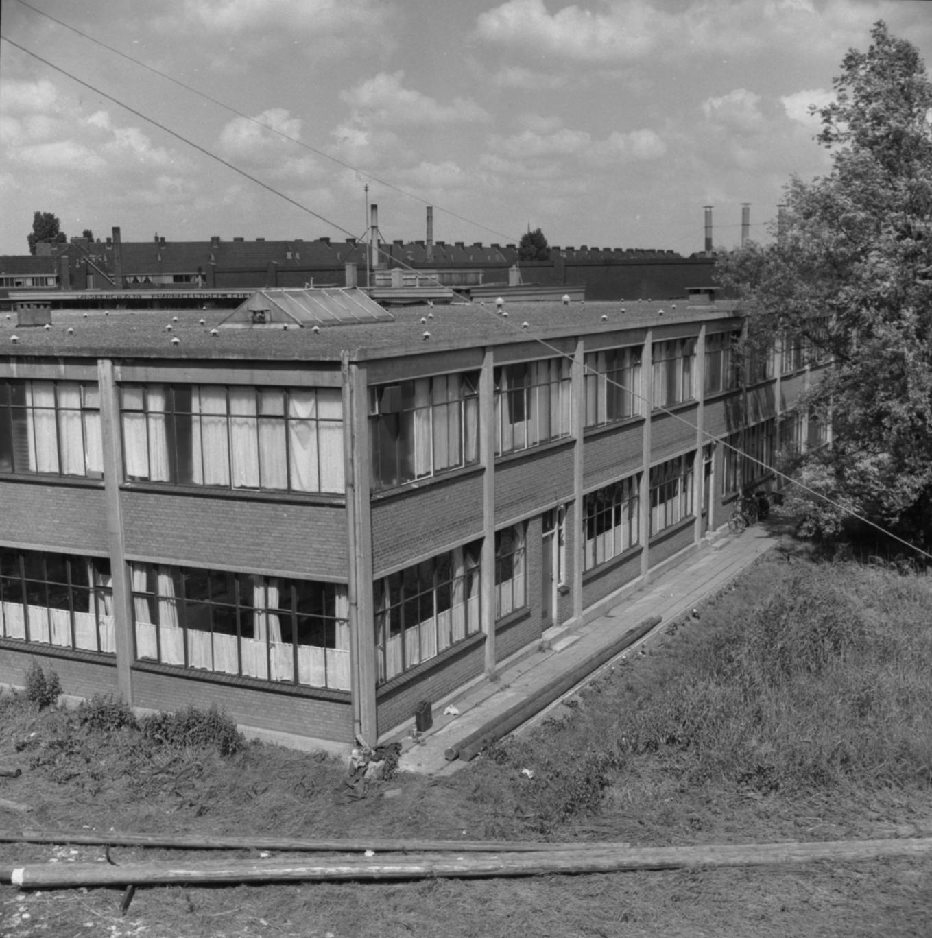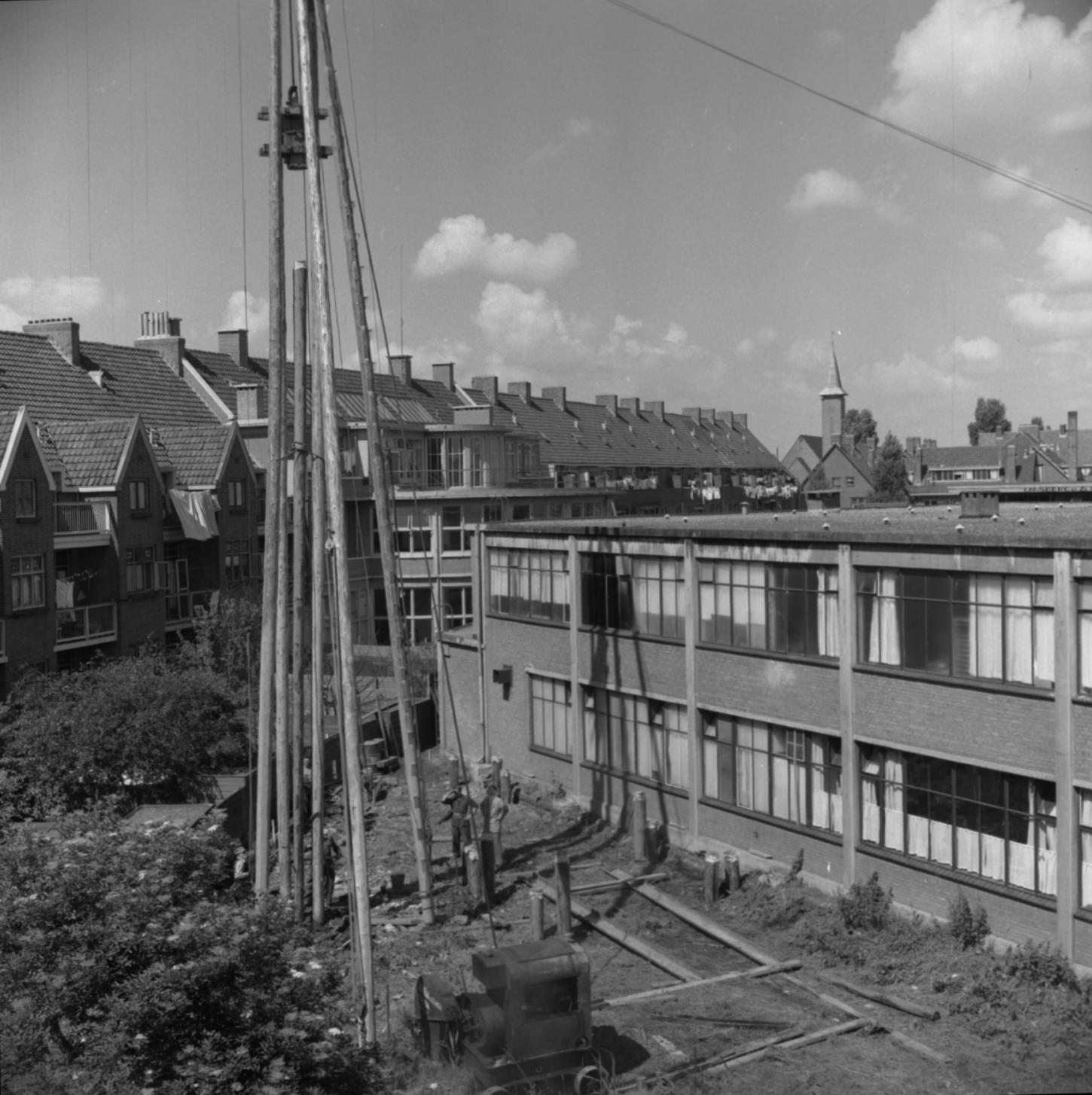 We zien de achterkant van de woningen aan de Rozenlaan bij de Ceintuurbaan in Rotterdam. Het is nieuwbouw of uitbreiding van een bedrijfspand aan de Ceintuurbaan.