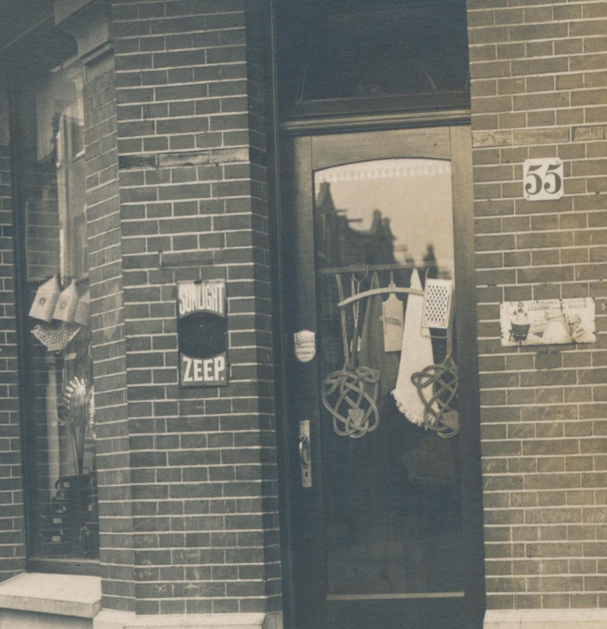 in de winkel valt te zien achter deur: mattenklopper, dweil, rasp, schaaf stamper; achter rechter raam: bezem, stoffer, olielamp, werkdoek, kop en schotel, koffiemolen;