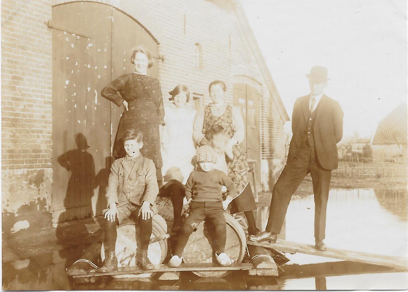 Lijkt een snapshot, maar is het niet. Ik denk namelijk niet dat een boer in zondags pak met zijn gezin (in nette kleding en zonder laarzen) gaat staan poseren als hij elk ogenblik het evenwicht zou kunnen verliezen. Er lijkt iets geschreven op de rechter schuurdeur, evenals op een baal op het vlot.