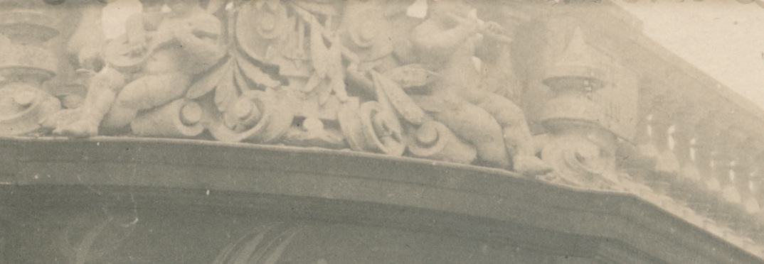 laag gebouw met erboven borstwering met 2 kindertjes, links met gitaar en rechts met fluit