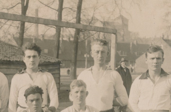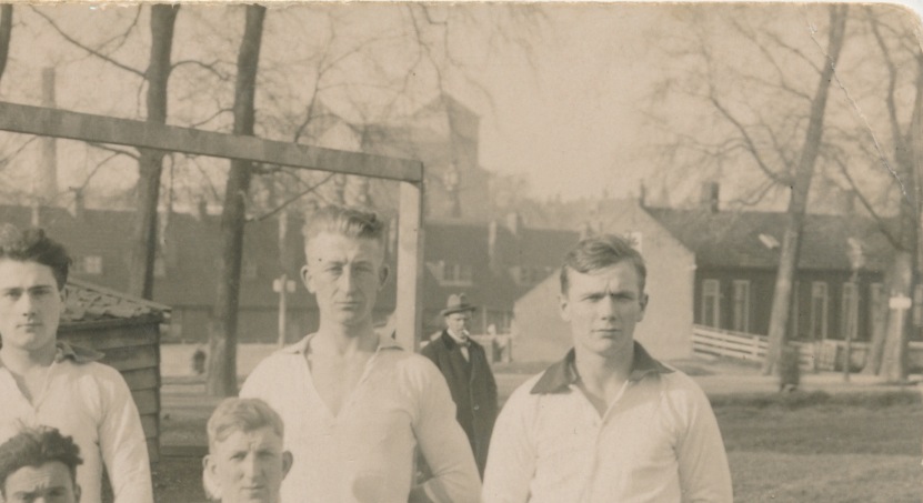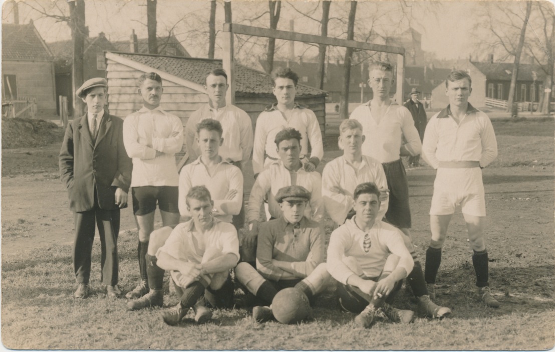 4314 hoogstwaarschijnlijk Rotterdam, voetbalelftal met hoog gebouw en schoorsteen